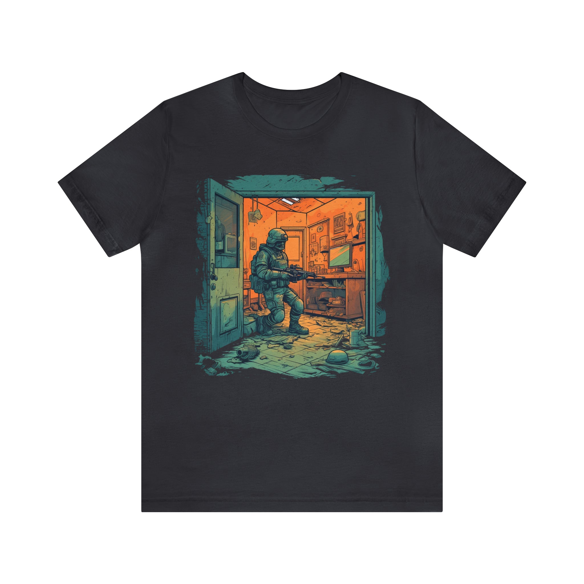 The shirt's design extends to the weaponry and gear, meticulously detailed to reflect the realism and precision demanded in the heat of battle. Rifles, grenades, and tactical equipment are rendered with authenticity, showcasing the tools of the trade for any soldier.